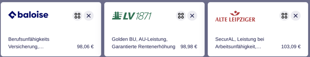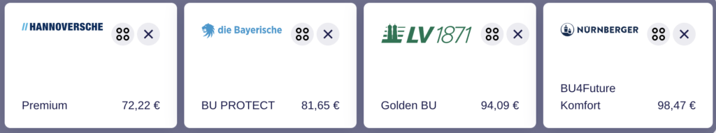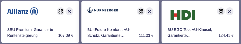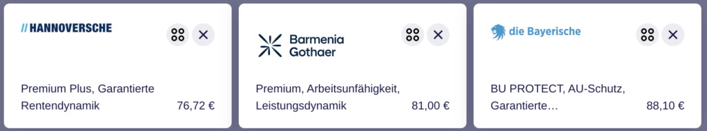 Anbei teile ich ein paar Auszüge aus BU-Anträgen für Psychotherapeuten inkl. der monatlichen Beiträge. Bitte bedenke, dass es sich dabei immer um Momentaufnahmen (aus Januar 2026) handelt.