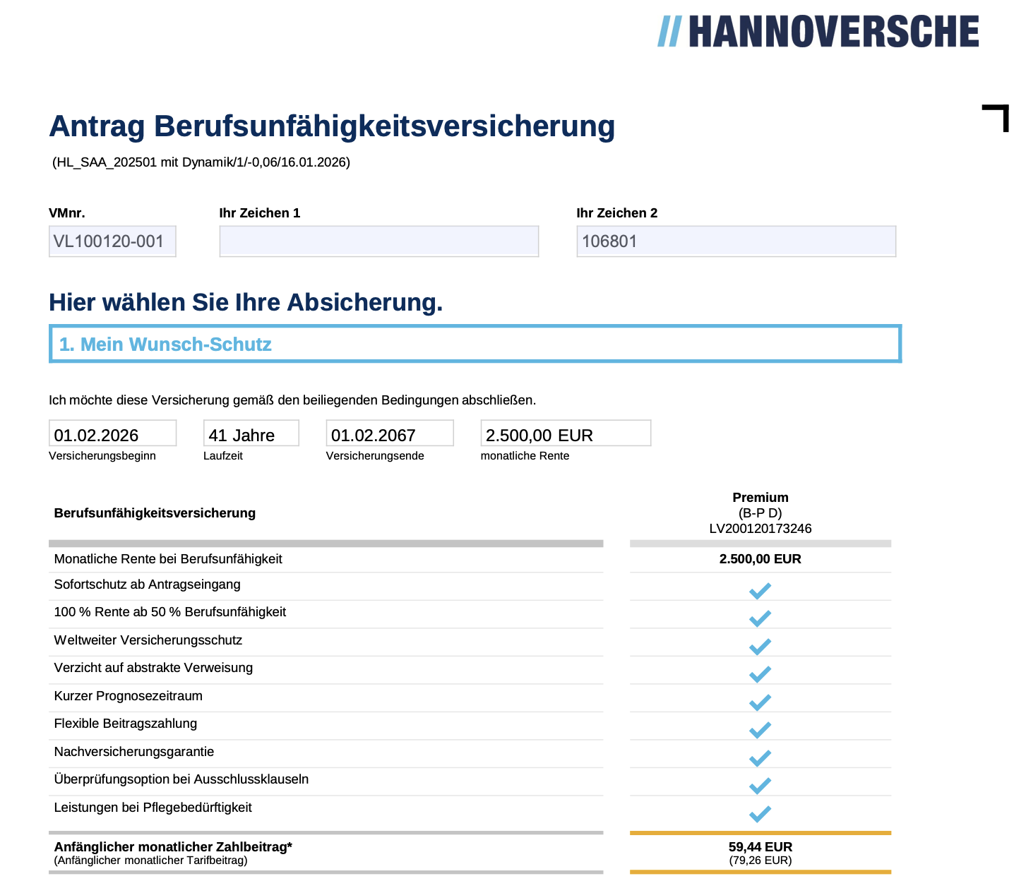 Kosten 2.500 € BU-Rente inkl. 2% Leistungsdynamik und AU-Klausel
